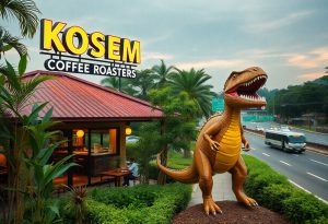 Newly opened cafe in Hua Hin, a check-in point on the bypass road, “Kosem Coffee Roasters” with a highlight corner, a very large dinosaur.